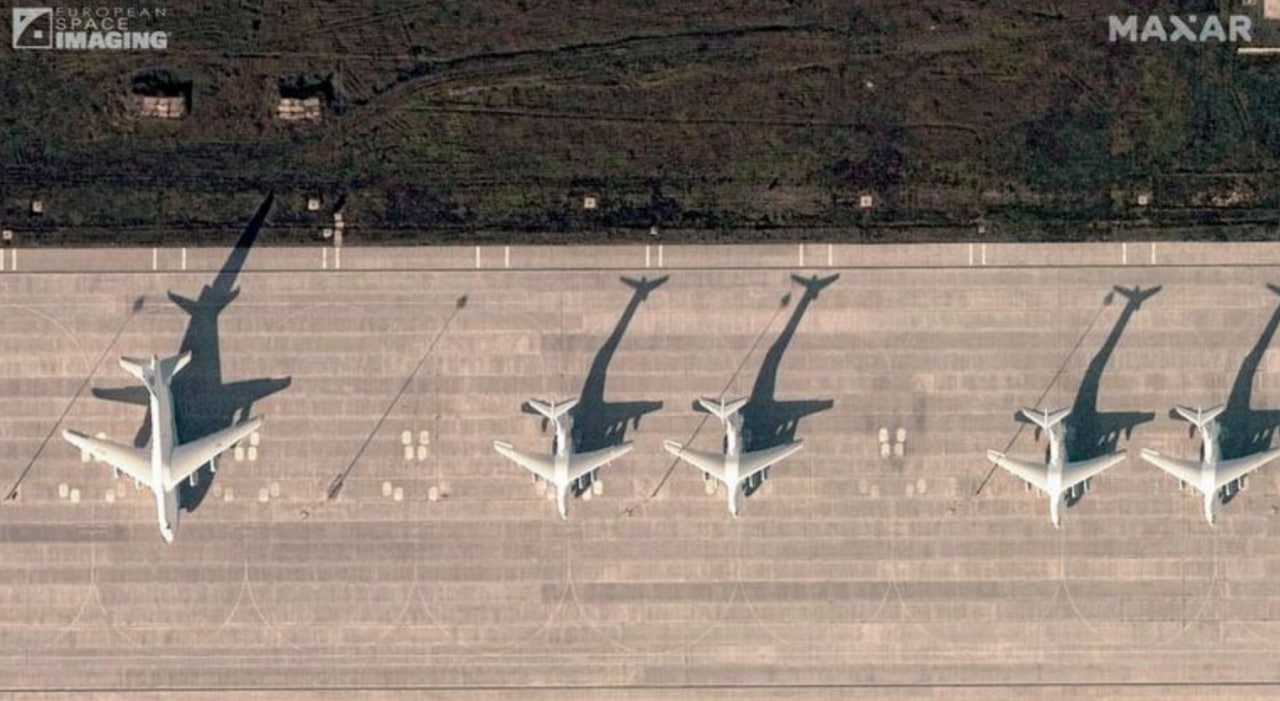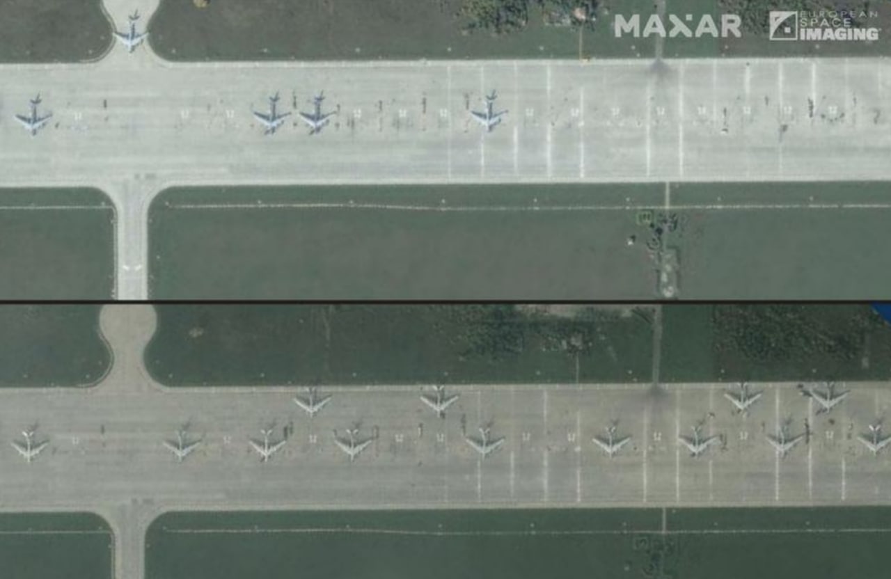 На снимках почти два десятка дальних бомбардировщиков Ту-95 и Ту-160 - а также топливозаправщики, ящики с боеприпасами и множеств грузовых самолетов.