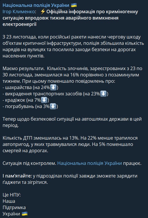 10:10 В течение недели после блекаута в Украине снизилась преступность.