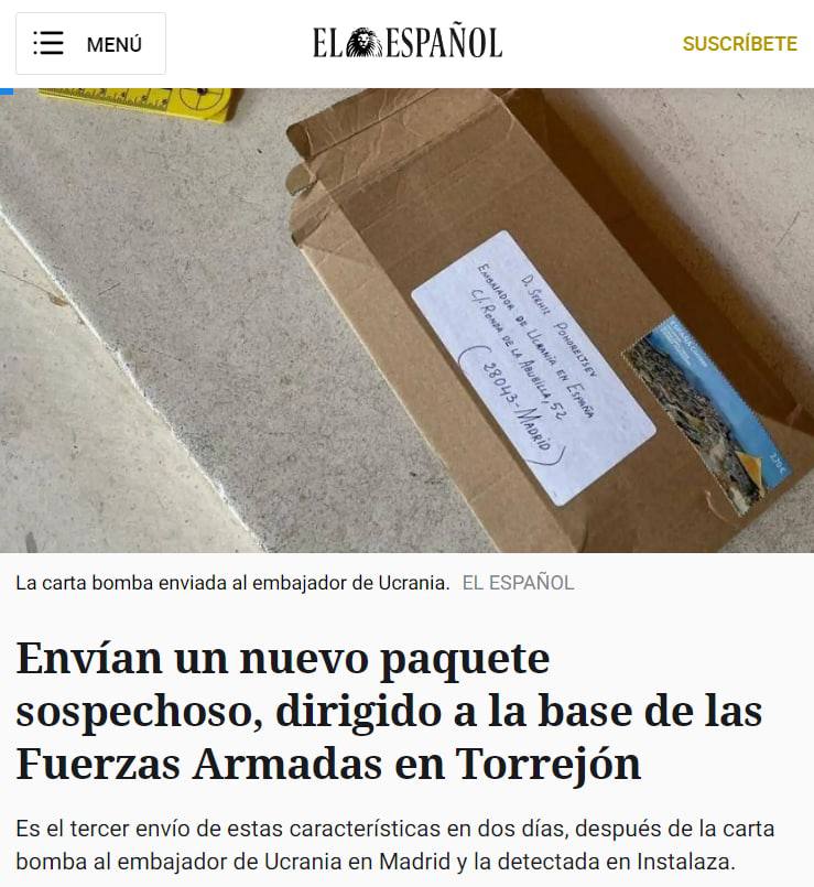 Напомним, первую посылку нашли в украинском посольстве в Мадриде, вторую - в компании, которая поставляла Украине вооружение, третью - на базе вооруженных сил в Торрехоне.