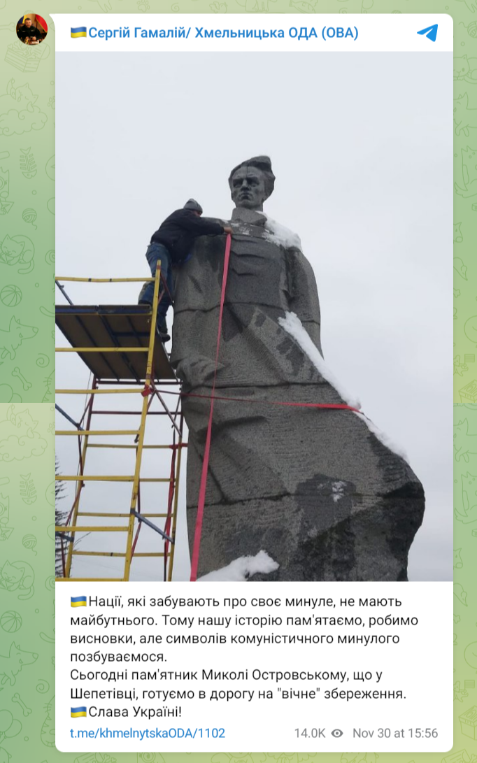 "У наций, которые забывают о своем прошлом, нет будущего. Поэтому нашу историю помним, делаем выводы, но от символов коммунистического прошлого избавляемся. Сегодня памятник Николаю Островскому в Шепетовке готовим в путь на "вечное" сохранение", - написал Гамалий.