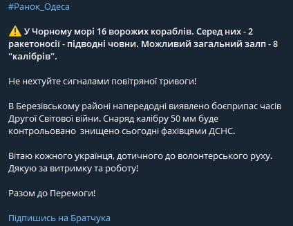 "В Черном море 16 вражеских кораблей. Среди них - 2 ракетоносители - подводные лодки. Возможен общий залп – 8 "калибров", – написал он.