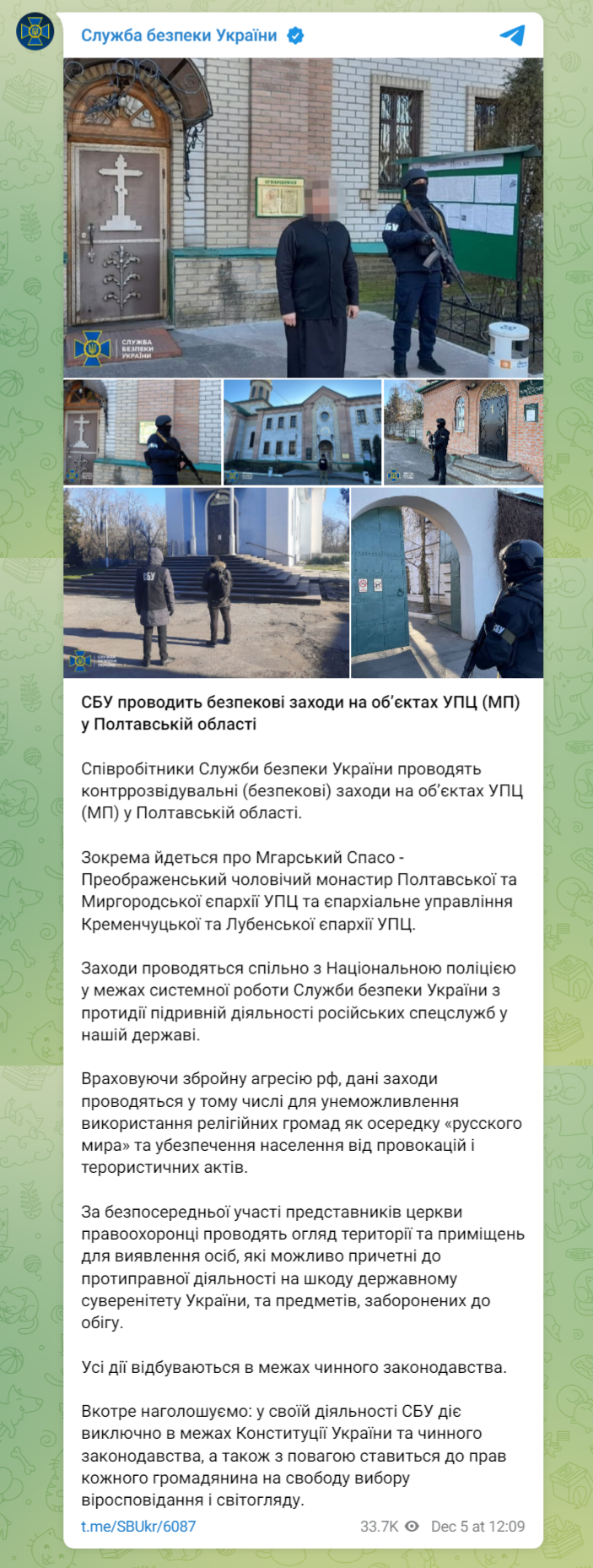 Служба безопасности Украины 5 декабря проводит обыски в Мгарском Спасо-Преображенском мужском монастыре УПЦ в Полтавской области.