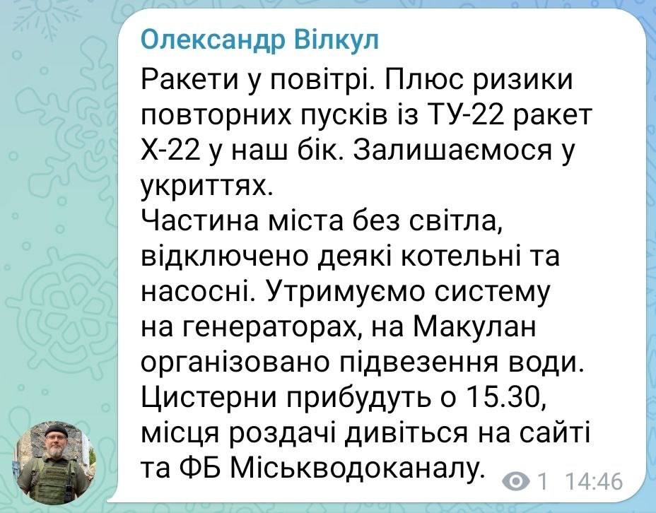 Также Глава городской администрации Кривого Рога Александр Вилкул сообщает, что в воздухе все ещё находятся ракеты. Есть угроза повторного удара. Часть Кривого Рога на данный момент без света.