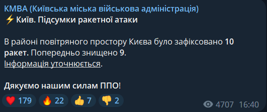 В Киевской области, как заявляет военная администрация, сбито 9 ракет из 10.