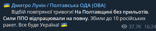 В Полтавской области, по данным главы ОВА, сбили 10 ракет.