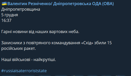 Глава Днепропетровской ОВА заявляет, что воздушное командование "Восток" сбило 16 ракет.