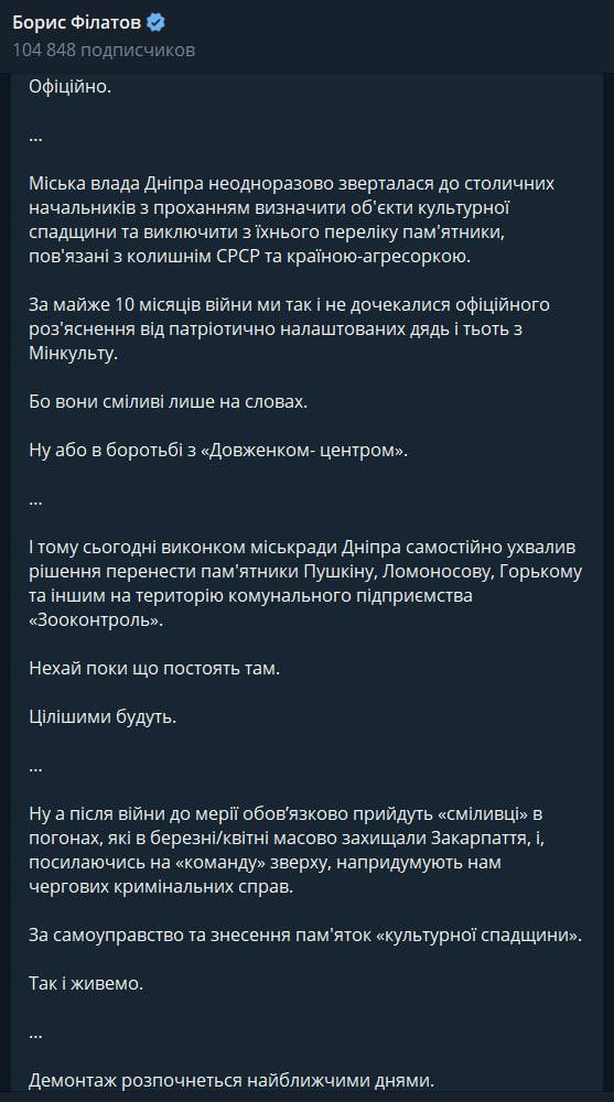 "Мы до сих пор ждем информацию от правоохранительных органов. Я считаю, это для них должно быть делом чести, потому что, на самом деле, как бы ни назывался этот памятник в народе, у него есть название. Это памятник милиционерам, потерявшим жизнь во время исполнения своих служебных обязанностей. У многих полицейских есть свои знакомые, друзья, которые потеряли своих собратьев во время выполнения своих обязанностей. Я думаю, после войны мы проведем архитектурный конкурс и восстановим этот памятник – без буденновки и меча со щитом. Но таким людям должен быть памятник, потому что это опасная работа – служить и защищать во время гражданской жизни и военной. У меня нет информации о тех, кто это совершил. Я, как и все, в ожидании публичной информации, кто это сделал, и зачем это было сделано. С другой стороны, если информация по этому памятнику кажется многим противоречивой, то есть еще второй памятник, в котором не было ни звезд, ни будённовок, ни серпа и молота. Это памятник скорбящей матери на Херсонском шоссе, он также был взорван. Это фактически могильная плита – память людям, погибшим во время Второй мировой войны. И я не хотел бы, чтобы сегодня происходили такие вещи, которые, возможно, будут происходить по отношению к памятникам тех людей, которым мы будем устанавливать мемориалы уже после этой войны", - сказал Сенкевич.