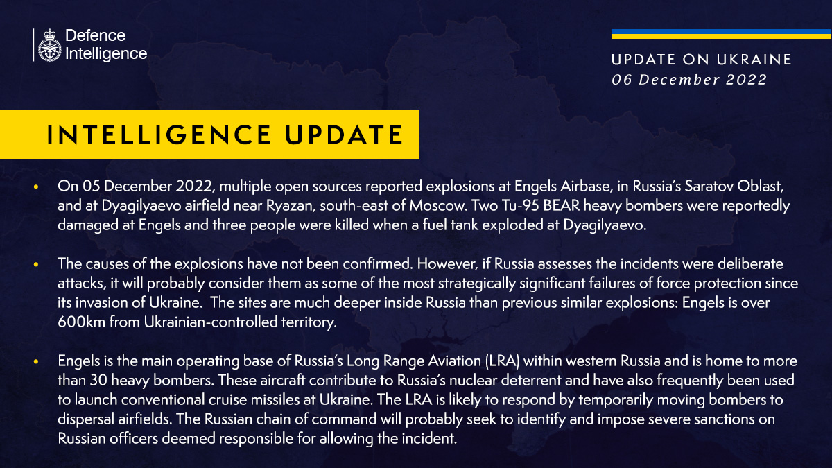 Британская разведка в новой сводке пишет о взрывах на авиабазе "Дягилево" под Рязанью и на аэродроме "Энгельс" в Саратовской области РФ.