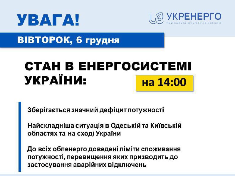 По данным компании, из-за атаки больше всего пострадали Одесская и Киевская области. Там сохраняется самая сложная ситуация. Из-за повреждений некоторых электростанций и части сетей в энергосистеме снизилось производство электроэнергии. Для сохранения баланса во всех регионах были временно применены аварийные отключения.