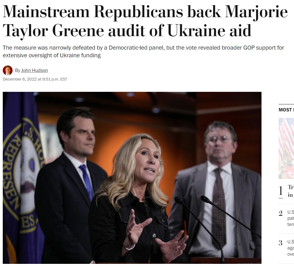 Хотя Тэйлор-Грин входит в группу поддержки Трампа, усиление контроля над ассигнованиями для Украины начали поддерживать и другие группы в Республиканской партии, сообщает Washington Post. В том числе те, кто выступает за сохранение этой поддержки.