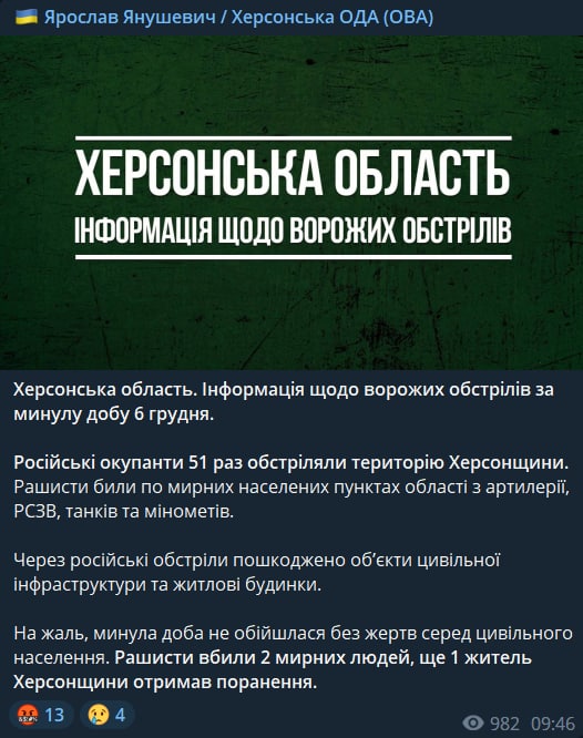 09:56 В Херсонской области за сутки погибли двое мирных людей, еще один - ранен.