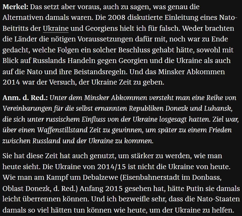 "Минские соглашения 2014 года были попыткой дать время Украине. Она также использовала это время, чтобы стать сильнее, как вы можете видеть сегодня. Украина 2014/15 - это не Украина сегодня", - заявила Меркель, приведя в качестве примера бои за Дебальцево в Донецкой области в 2015 году.