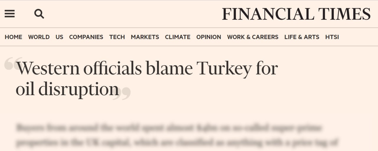 12:22 Запад обвинил Турцию в блокировании поставок нефти на мировой рынок, пишет Financial Times со ссылкой на источники в правительственных кругах западных стран.