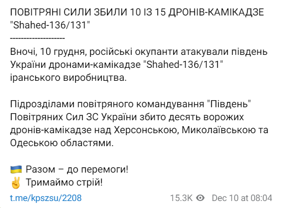 По данным военных, всего силами противовоздушной обороны было сбито 10 запущенных россиянами дронов-камикадзе из 15: 4 "Shahed-136" сбиты над Херсонской областью, 4 - над Николаевской и 2 - над Одесской.