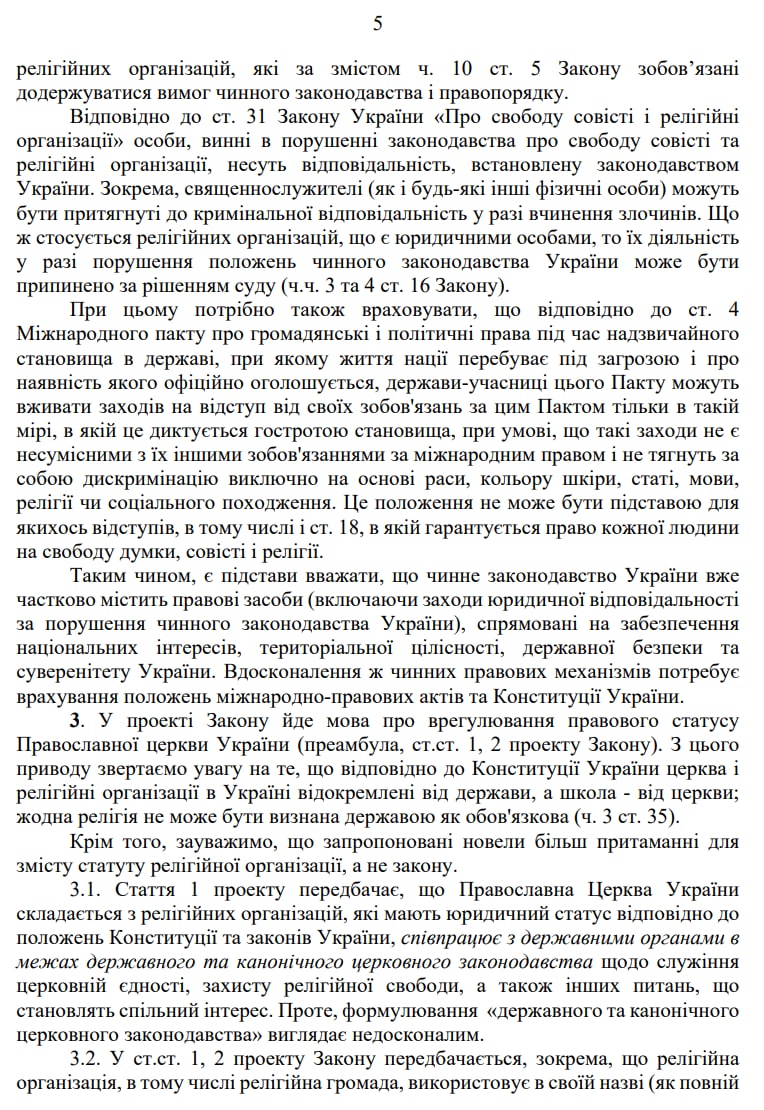 На это научно-экспертное управление Рады, ссылаясь на Конституцию, замечает, что "Украина является светским государством, что исключает возможность установления на законодательном уровне каких-либо преимуществ для тех или других религиозных организаций".