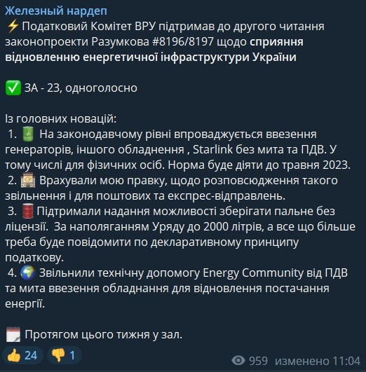 1. Поддержка на законодательном уровне ввоза генераторов, Starlink и другого оборудования без таможенного сбора и НДС, в т.ч. и для физлиц до мая следующего года (в том числе, и через почтовые и экспресс-отправки);