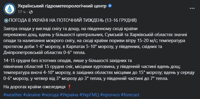 Погода в ближайшие дни будет без осадков, за исключением западной Украины, там ожидается метель, и южной, там ожидаются дожди.
