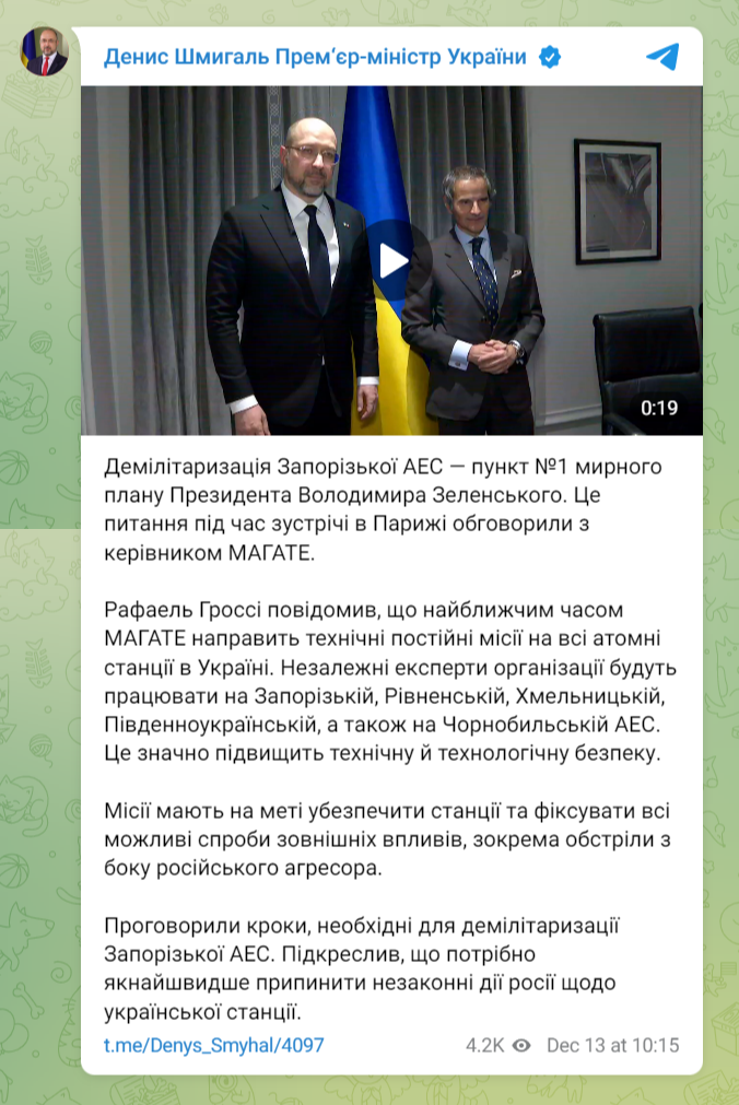 Шмыгаль также подчеркнул, что демилитаризация Запорожской АЭС - это пункт №1 мирного плана, предложенный президентом Владимиром Зеленским.
