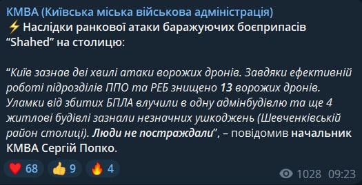 9:00 Киевская военная администрация заявляет, что сбито уже 13 дронов-камикадзе.