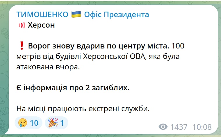 "Есть информация о двух погибших. На месте работают экстренные службы", - написал Тимошенко.
