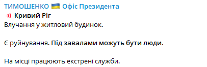 "Кривой Рог. Попадание в жилой дом. Есть разрушения. Под завалами могут быть люди. На месте работают экстренные службы", - написал Тимошенко.