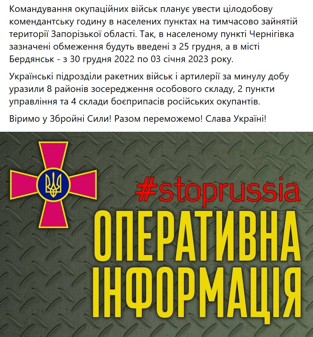 3. Россияне планируют ввести круглосуточный комендантский час в Бердянске с 30 декабря по 3 января (с российской стороны о таких планах не сообщалось).