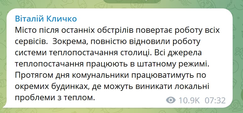 08:39 На это утро тепло вернули всем киевлянам, но местами оно еще может отсутствовать, заявил мэр Киева Виталий Кличко.