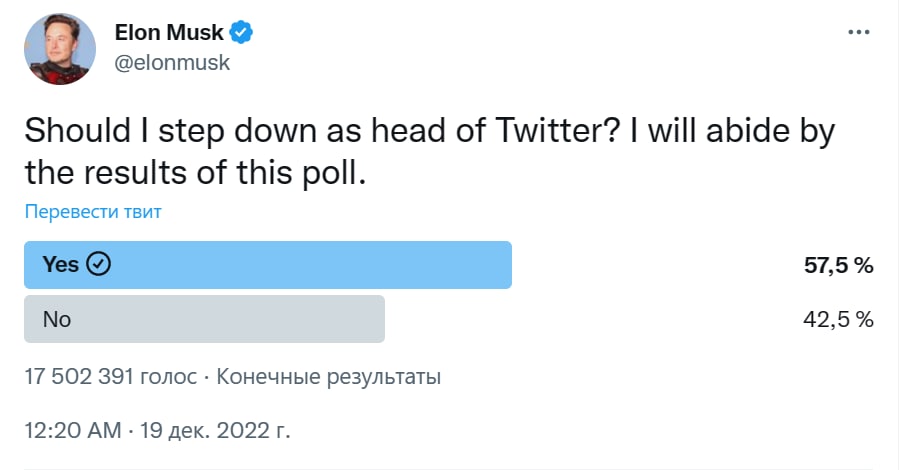 14.11 Закончился опрос Илона Маска о том, нужно ли ему дальше руководить Твиттером.