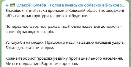 12.25 В результате ночной атаки беспилотников три человека получили ранения, девять домов повреждены. Об этом сообщил глава полиции Киевской области Андрей Небитов.