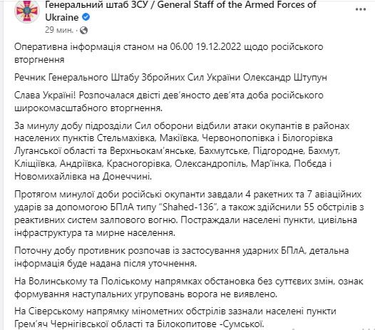 В понедельник, 19 декабря, в Украине идет уже 299-й день войны с РФ.