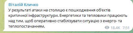 07.55 В результате утренней атаки в Киеве есть повреждения объектов критической инфраструктуры.