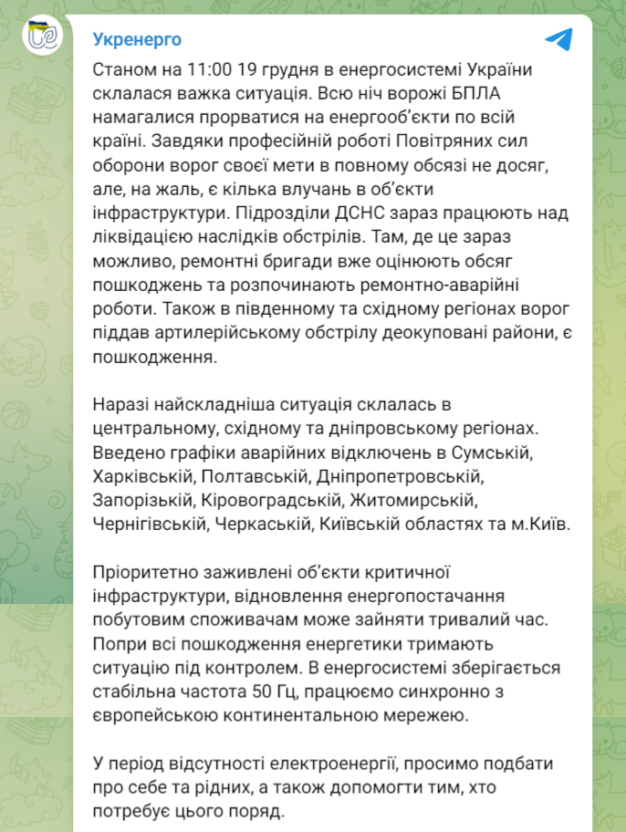"Укрэнерго" ввело аварийные отключения после ночной атаки дронов. Фото: соцсети