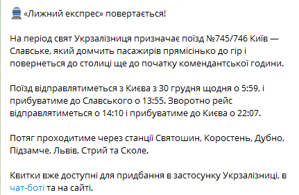 "Поезд будет отправляться из Киева с 30 декабря ежедневно в 05:59 и прибывать в Славское в 13:55.