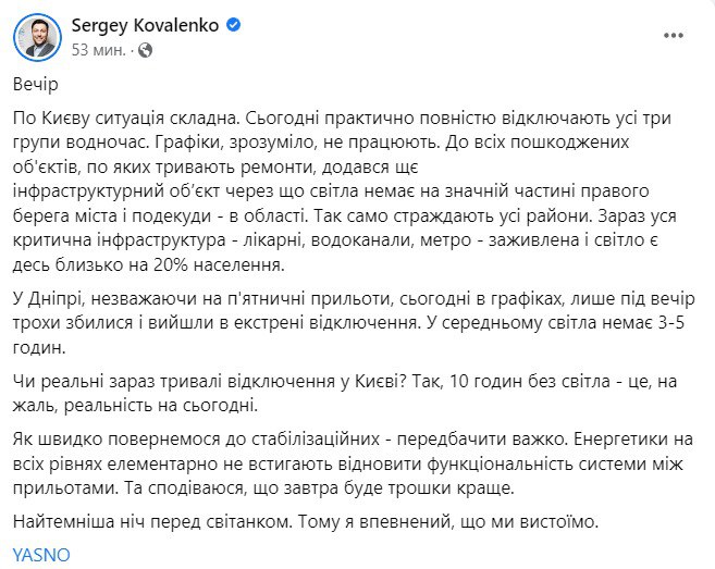 "Реальны ли сейчас длительные отключения в Киеве? Да, 10 часов без света – это, к сожалению, реальность на сегодняшний день. Как быстро вернемся к стабилизационным, предсказать трудно", – отметил Сергей Коваленко.