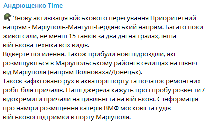 Также, по его информации, прибыли новые подразделения, которые размещаются в Мариупольском районе в поселках севернее Мариуполя (направление Волноваха/Донецк). Кроме того, зафиксировано движение в акватории порта и начало ремонтных работ у причалов.