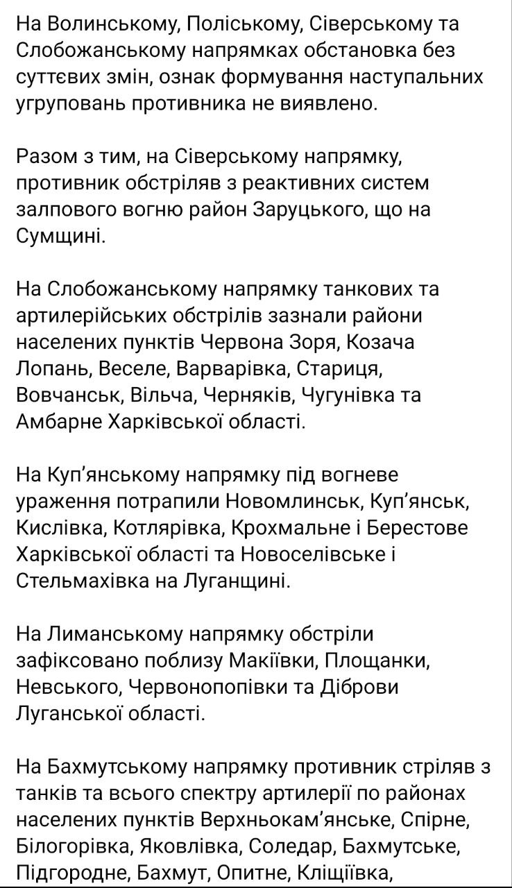 ВСУ отразили атаки россиян в Новоселовском, Площанке, Стельмаховке, Червонопоповке (Луганская область) и Берестовом, Яковлевке, Соледаре, Бахмуте, Опытном, Курдюмовке, Озаряновке, Майорске, Нью-Йорке, Красногоровке, Невельском, Марьинке (Донецкая область).