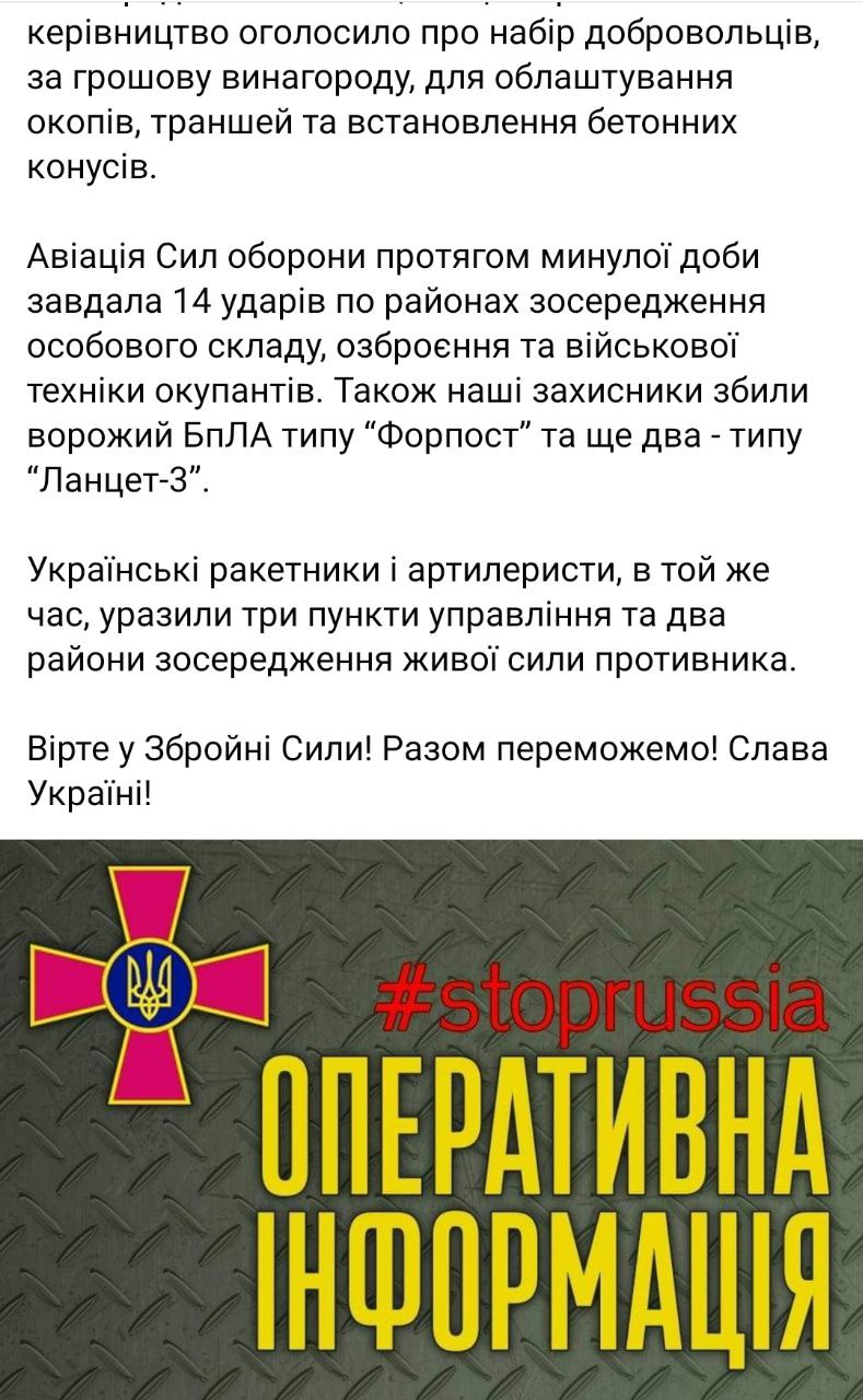 3. Отражены атаки россиян в Новоселовском, Площанке, Стельмаховке, Червонопоповке (Луганская область) и Берестовом, Яковлевке, Соледаре, Бахмуте, Опытном, Курдюмовке, Озаряновке, Майорске, Нью-Йорке, Красногоровке, Невельском, Марьинке (Донецкая область).