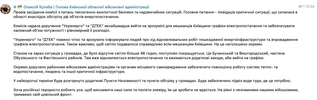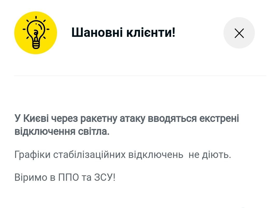 "Главной проблемой является не генерация, а доставка питания потребителям. Именно из-за разрушенных сетей и узлов большинство киевлян не могут получить свет в свои дома. Поэтому до сих пор действуют только аварийные отключения электроэнергии, длительность которых невозможно регламентировать", – заявил глава КГВА Сергей Попко.