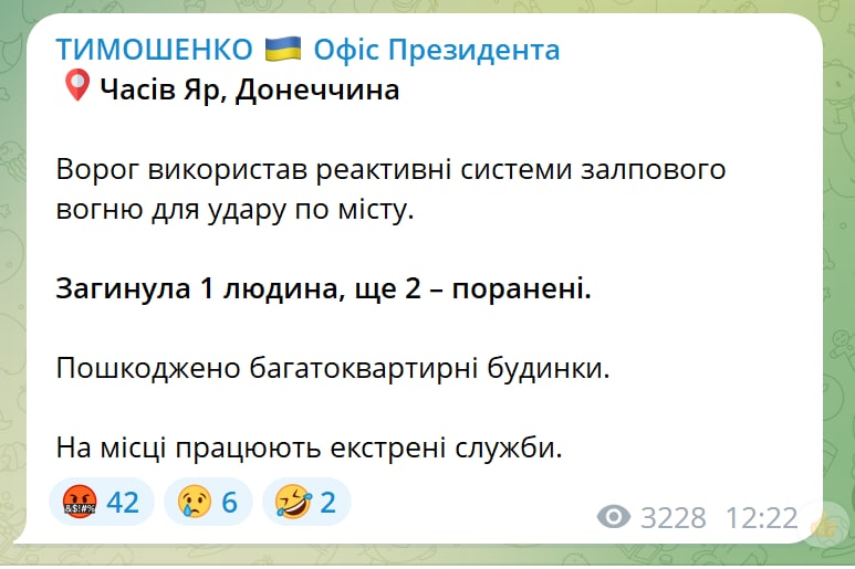 Также Лукашук сообщил об артобстреле Марганецкой и Красногригорьевской общин Никопольского района и Великомихайловской общины Синельниковского района. В Красногригорьевке пострадали три частных дома, в Великомихайловке повреждены линии электропередач.