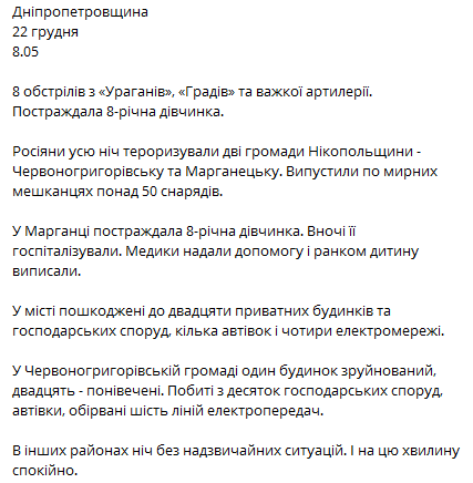 Ночью 22 декабря россияне 8 раз обстреляли из "Ураганов", "Градов" и тяжелой артиллерии Днепропетровскую область. Пострадала 8-летняя девочка.