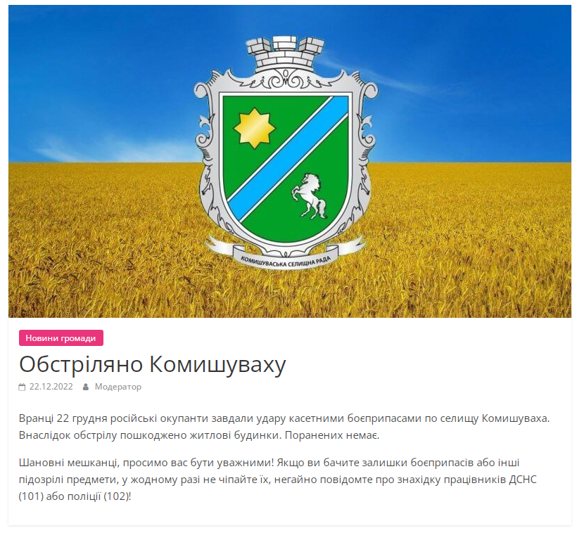 В четверг, 22 декабря, россияне нанесли удары кассетными боеприпасами по селу Камышеваха Запорожской области.