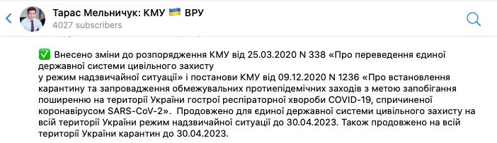 "Внесены изменения в распоряжение КМУ от 25.03.2020 N 338 "О переводе единой государственной системы гражданской защиты в режим чрезвычайной ситуации" и постановления КМУ от 09.12.2020 N 1236 "Об установлении карантина и введении ограничительных противоэпидемических мер с целью предотвращения распространения на территории Украины острой респираторной болезни COVID-19, вызванной коронавирусом SARS-CoV-2". Продлен для единой государственной системы гражданской защиты на всей территории Украины режим чрезвычайной ситуации до 30.04.2023. Также продлен по всей территории Украины карантин до 30.04.2023", - написал он.