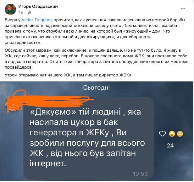 "Я живу в ЖК, где сейчас, как у всех, перебои. В цоколе соседнего дома ЖЭК, они поставили себе в подвале генератор. От этого же генератора запитали оборудование одного из местных провайдеров. Утром открываю чат нашего ЖК, а там пишет директор ЖЭКа: