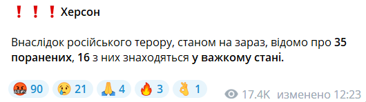 В Херсоне после сегодняшнего обстрела РФ количество раненых людей выросло до 35 человек, 16 из них находятся в тяжелом состоянии. Также 5 человек погибли.