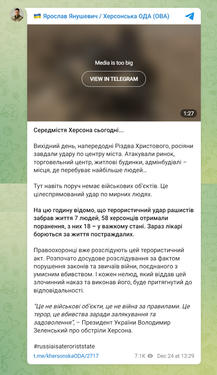 В канун Рождества, 24 декабря, россияне нанесли удар по центру Херсона, атаковав рынок, торговый центр, жилые дома, админздания – места, где находятся больше всего людей. По последним данным Херсонской ОВА, число погибших выросло с 5 до 7 человек, 58 жителей получили ранения, 18 из них - в тяжелом состоянии.
