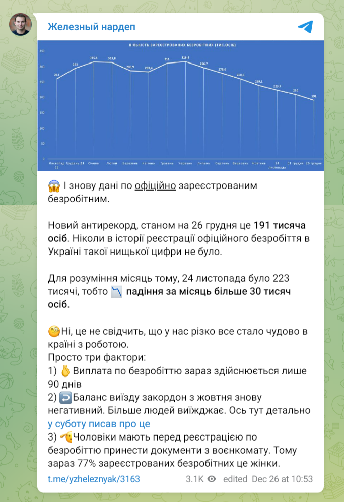По состоянию на 26 декабря 2022 года в Украине официально зарегистрировано 191 тысячу безработных. За последний месяц безработных стало на 32 тысячи меньше.