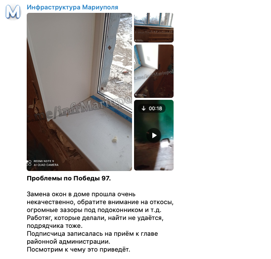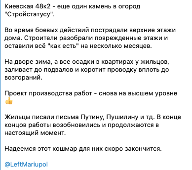 "Среди восстанавливаемых сейчас домов полностью готовых единицы. При этом зачастую до восстановления плоской кровли она не текла, даже после боевых действий, а после восстановления начала течь, как в нескольких МКД на Восточном", - говорит житель Мариуполя Виталий.