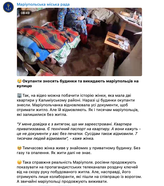 В частности, они публикуют видео, на котором местная пенсионерка рассказывает, что дом с ее двумя квартирами в Кальмиусском районе попал под снос, а в предоставлении нового жилья ей отказывают из-за якобы ошибок в документах.