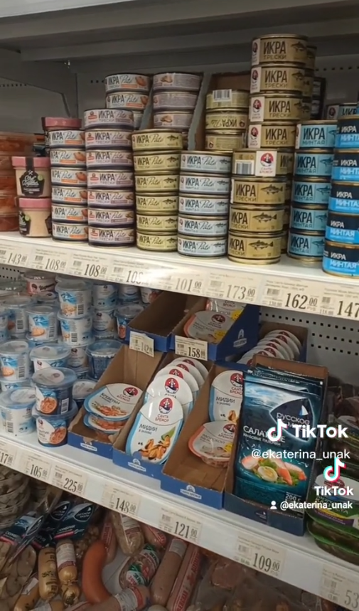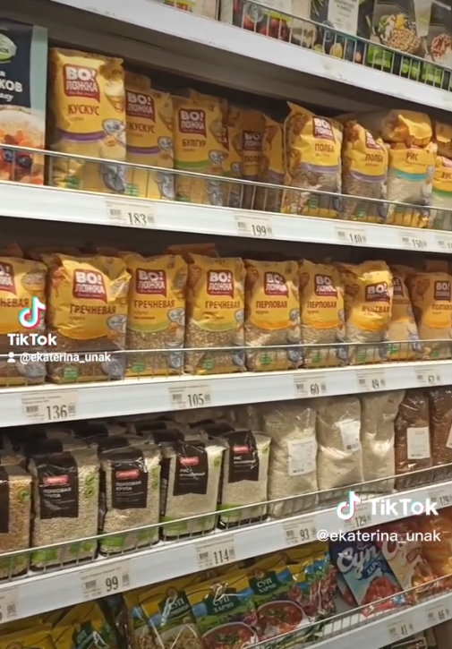 Судя по роликам из местных супермаркетов, пачка риса или гречки там стоит 100-150 рублей (50-70 гривен при курсе 2 к 1), упаковка творога - 166 рублей (80 гривен), йогурт - 67 рублей (30 гривен), пельмени - 260-315 рублей за килограмм (130-160 гривен).