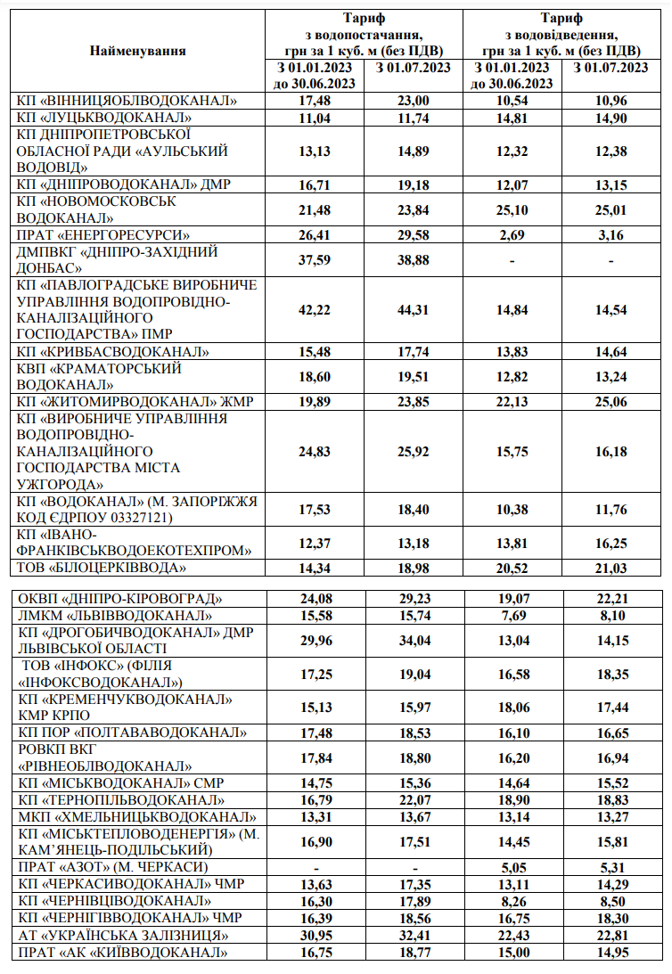 Речь идет об изменении тарифов на централизованное водоснабжение и водоотвод лицензиатам НКРЭКУ, реализующим воду или очищающим сточные воды другим предприятиям водопроводно-канализационного хозяйства (то есть оптовый тариф), а также тарифов на централизованное водоснабжение и водоотвод для всех остальных потребителей.